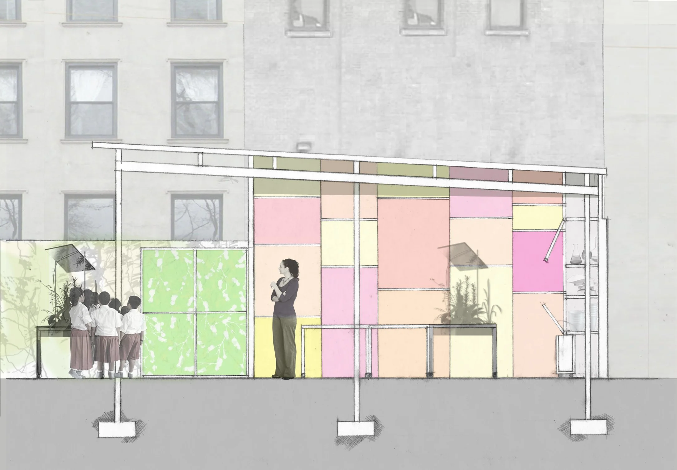 Our work with the Local Initiatives Support Corporation (LISC) provoked discussions with clients concerning how to address the particular programmatic needs of afterschool as distinct from school-time programming. Our work with the Horace Mann School included considering how their Reggio Emilia teaching methodology might guide the design of their Manhattan Nursery division. The Mt. Carmel school wanted a science lab but had no extra classroom space. The Incarnation School in Washington Heights wanted a rooftop playground that also provoked students’ curiosity concerning their neighborhood.